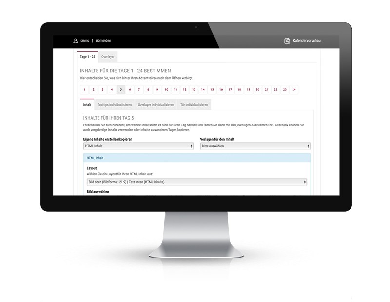 Nein, für die Erstellung Ihres Online-Adventskalenders sind keine Programmierkenntnisse erforderlich. Alle Inhalte lassen sich ganz einfach über eine benutzerfreundliche, webbasierte Oberfläche anlegen und gestalten. So können Sie Texte, Bilder, Videos und Gewinnspiele selbst verwalten – schnell, intuitiv und ohne technische Vorkenntnisse.